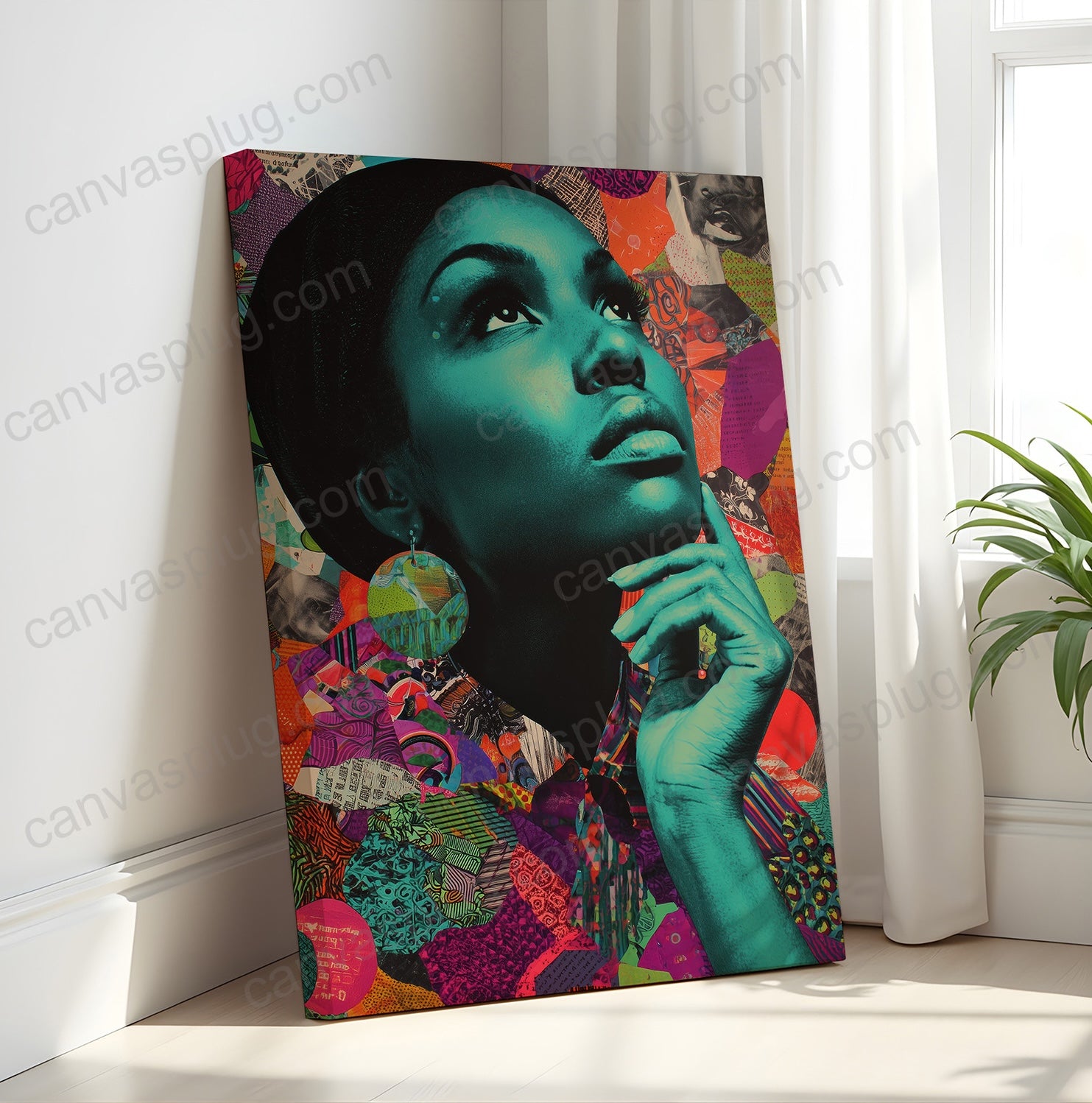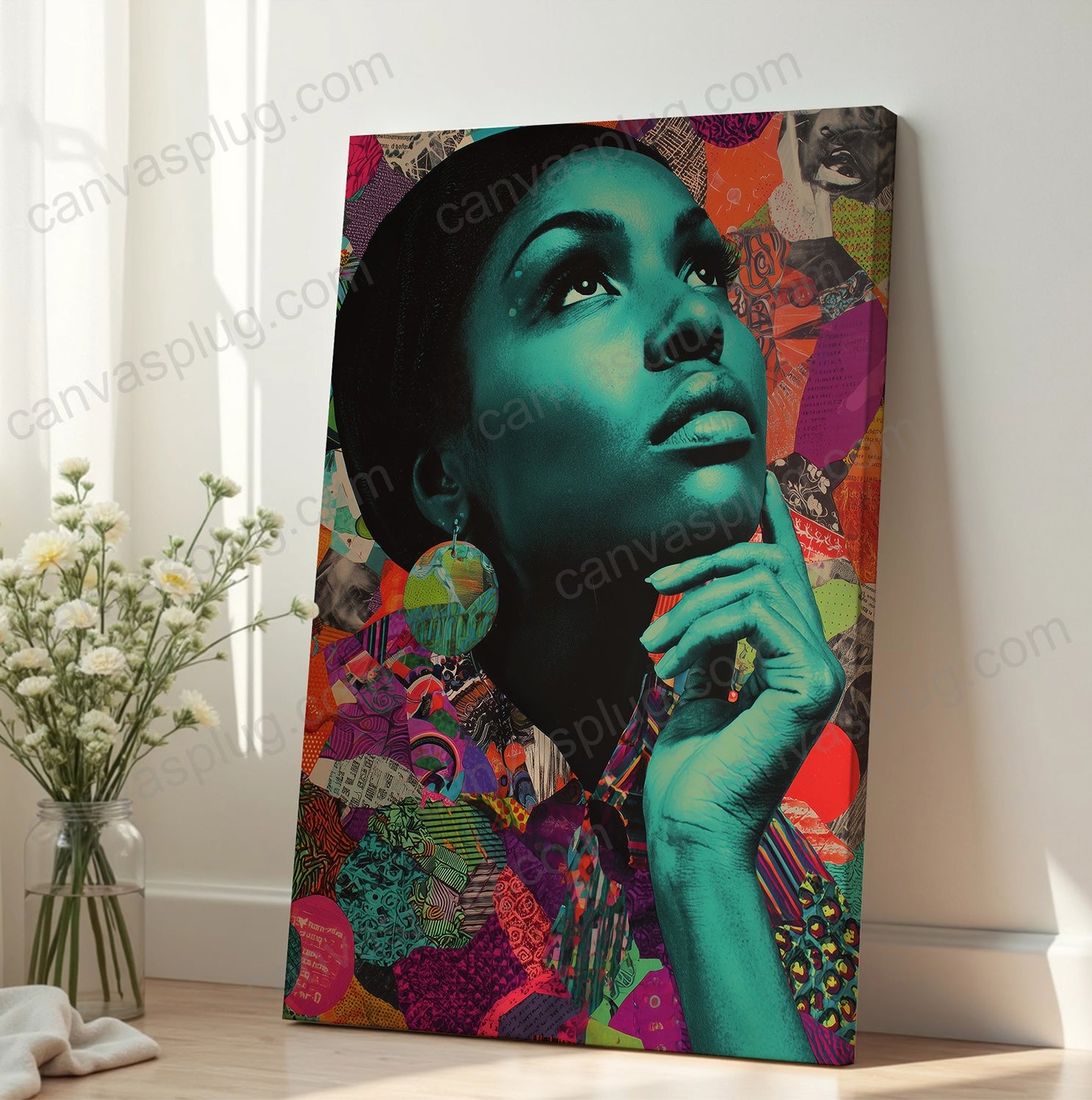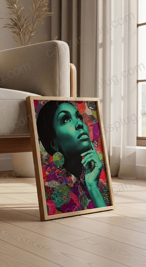 A luminous portrait layered in rich teal and vibrant collage, Ascension captures a moment of vision and becoming. The upward gaze speaks to growth, clarity, and quiet power, while saturated textures of pattern and color represent depth of culture and identity.