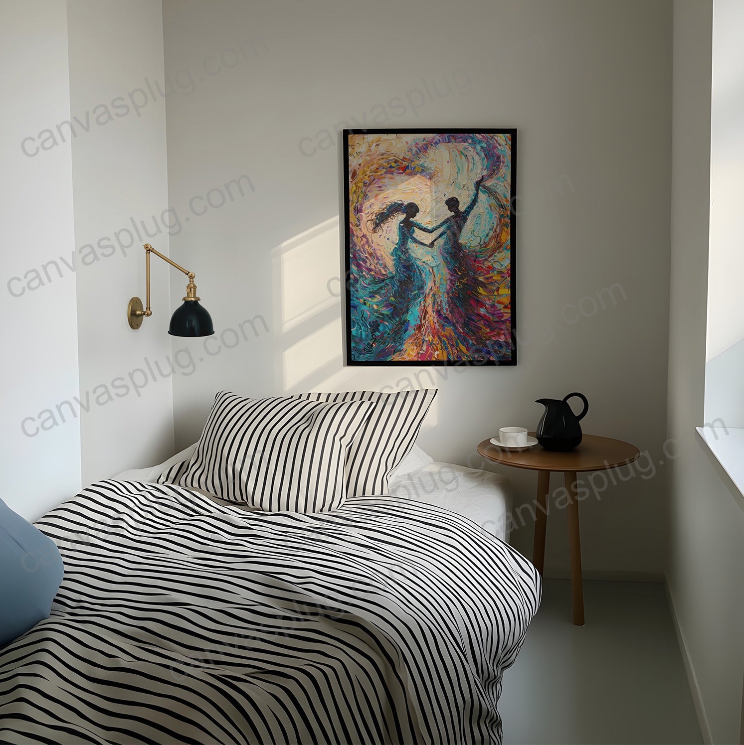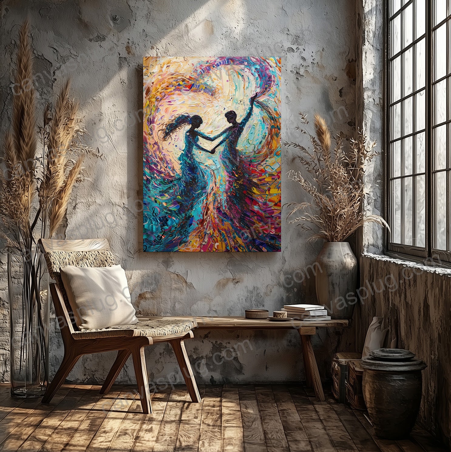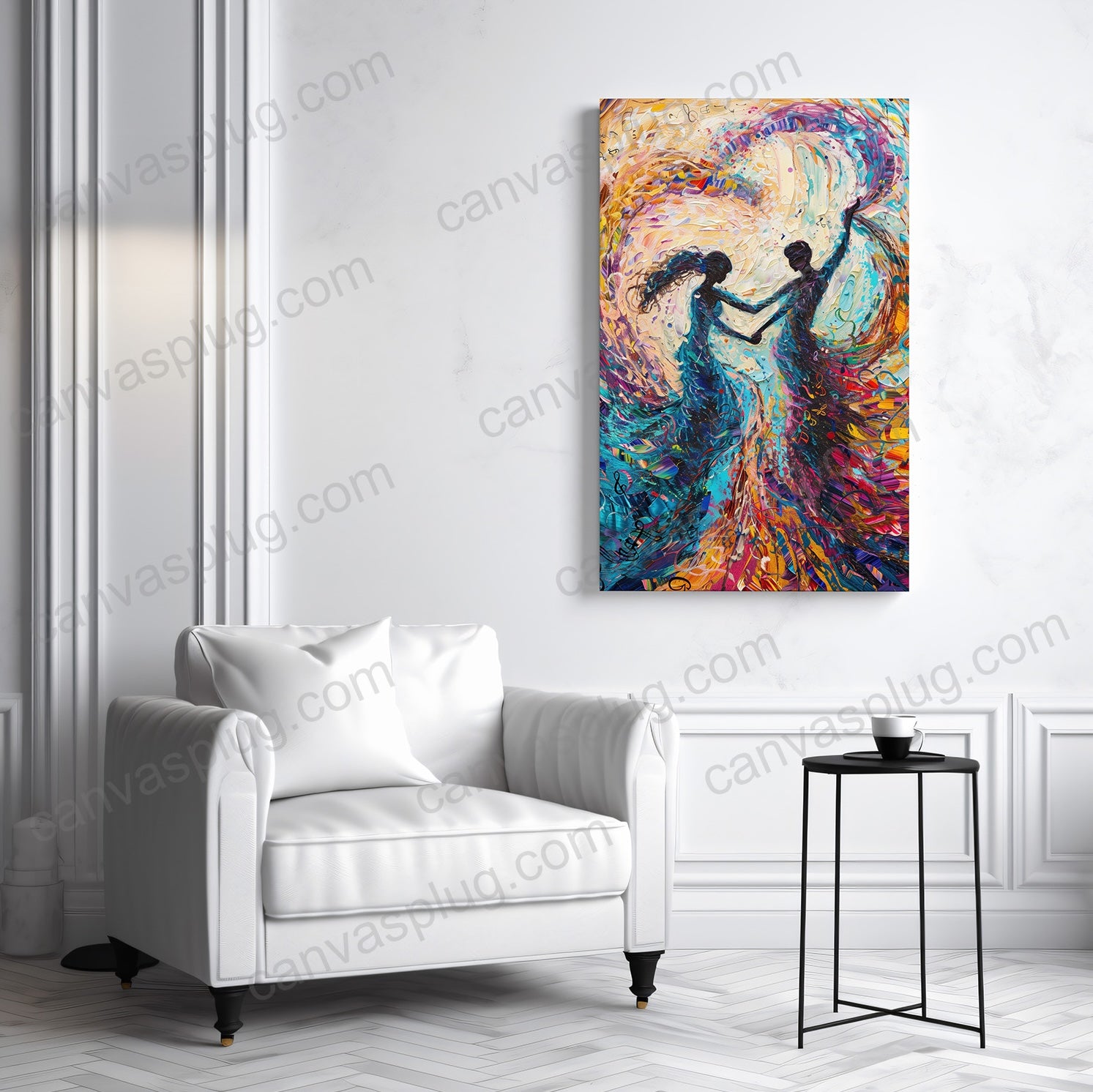 Harmony in Hue captures the quiet rhythm between two souls moving as one. Flowing through layers of vibrant color and expressive motion, the figures dissolve into a shared spectrum — symbolizing connection, balance, and emotional unity. Each brushstroke reflects the energy of love in motion, where individuality remains intact yet beautifully intertwined. This piece brings warmth, movement, and a sense of emotional harmony to any space, serving as a reminder that the strongest connections are felt, not spoken.
