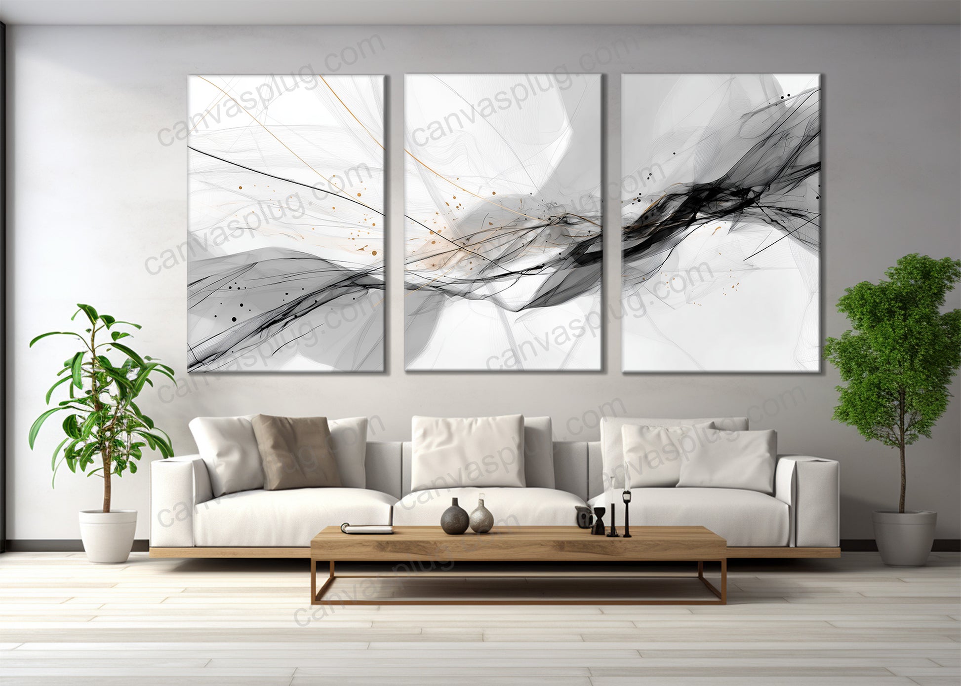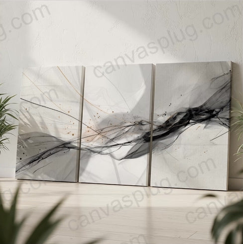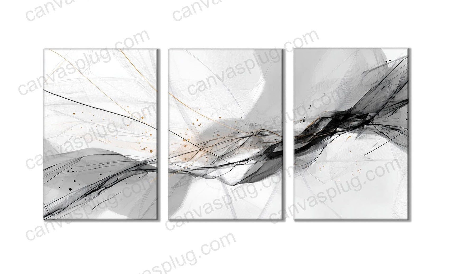 Elevate your space with this striking three-panel canvas set, where soft neutral tones meet sweeping black movement and subtle gold accents. The composition flows seamlessly across each panel, creating depth, balance, and quiet intensity that anchors the entire room.